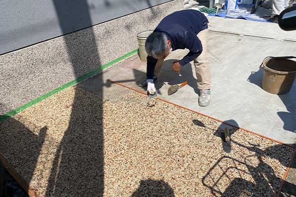 セメントやモルタルに砂利や小石(種石)を混ぜて塗り、乾いてしまう前に表面を水で洗い流すことで、砂利や小石が露出するように仕上げる工法です。露出することで自然な風合いを出すことができます。